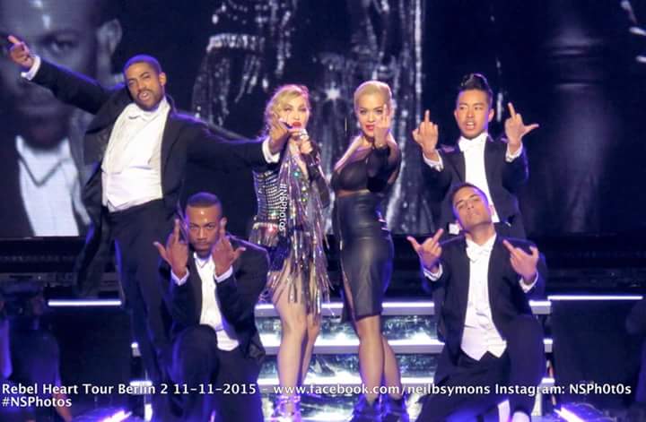 Infatti dopo averla vista prendere parte alle riprese dell’ultimo video girato dalla signora Ciccone, Bitch I’m Madonna (dove Rita appare per un breve cameo insieme a tanti altri protagonisti dello showbiz USA), ieri sera le due “amiche” si sono ritrovate (per caso?) a Berlino sul palco del Rebel Heart Tour durante la ormai famosa performance della banana in Unapologetic Bitch.